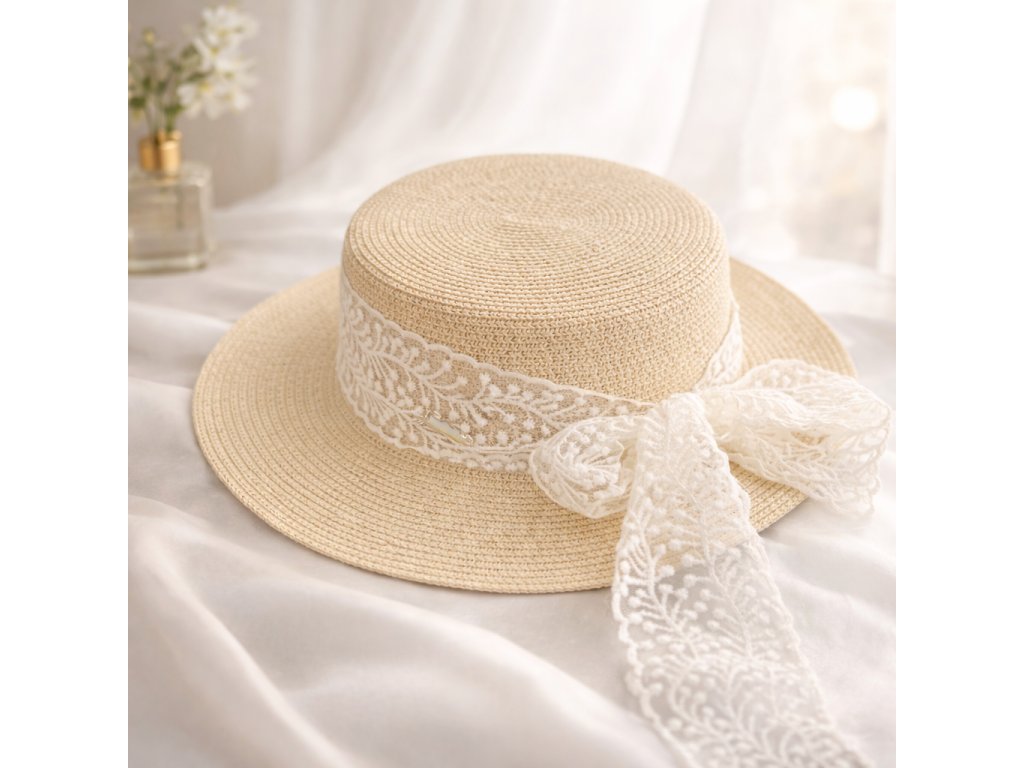 Krásný romantický klobouček světlé barvy s nádhernou stuhou. Stuha stylu krajky. Velikost sedí 56-58.