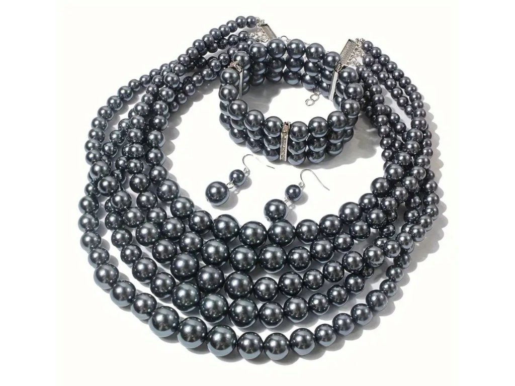 Luxusní sada šperků z tmavých perliček. Tato luxusní sada je tvořena masivním náhrdelníkem, náramkem a náušnicemi.