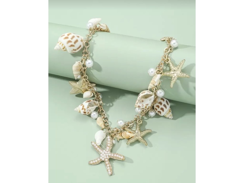 Náhrdelník - řetízek zlaté barvy s aplikací mušliček. Lze doladit náramkem ve stejném stylu.