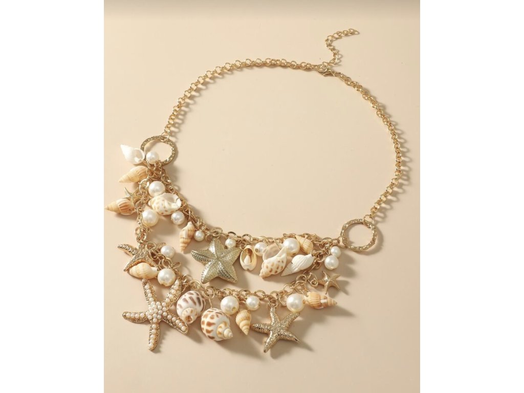 Krásný náhrdelník ve zlaté barvě s aplikací perliček a mušlí.