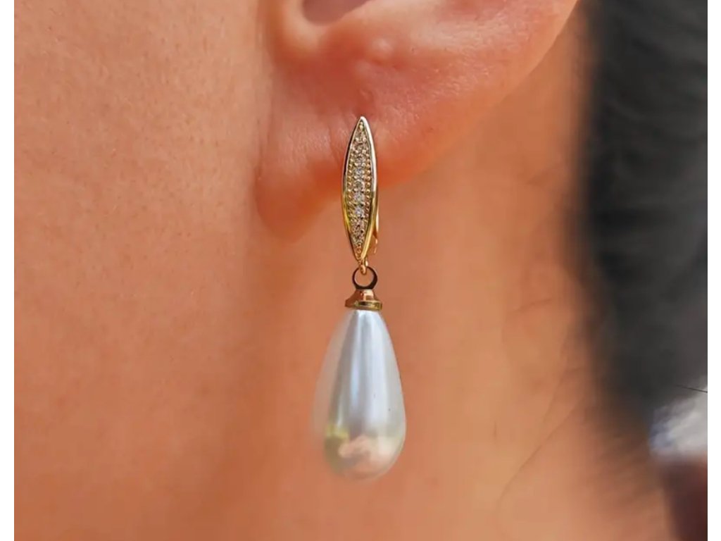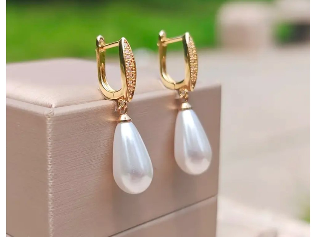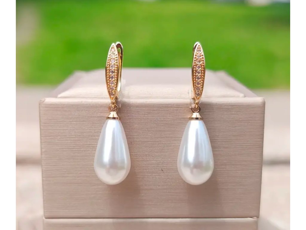 Zirkonové náušnice s imitací perly. Náušnice jsou ve zlaté barvě.